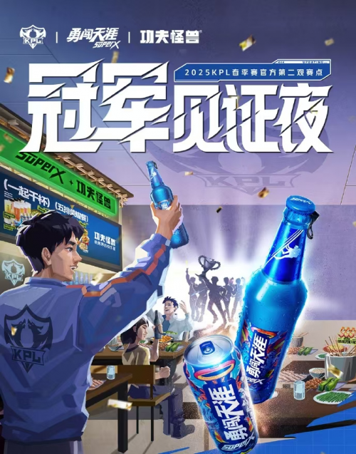 自2023年起,勇闯天涯superX连续三年成为KPL的年度合作伙伴,通过一系列创新举措,将品牌精神与电竞文化深度融合。品牌打造了「勇闯巅峰冠军之夜」和「冠军见证夜」两大自有IP,并推出限量「冠军庆功酒」,将胜利时刻的仪式感拉满,传递出品牌与电竞天然契合的“挑战”精神。在赛事现场,品牌元素贯穿全年赛事周期,从选手休息区的定制冰柜到赛后采访环节的“胜利碰杯”,勇闯天涯superX的品牌形象始终与电竞粉丝紧密相连。